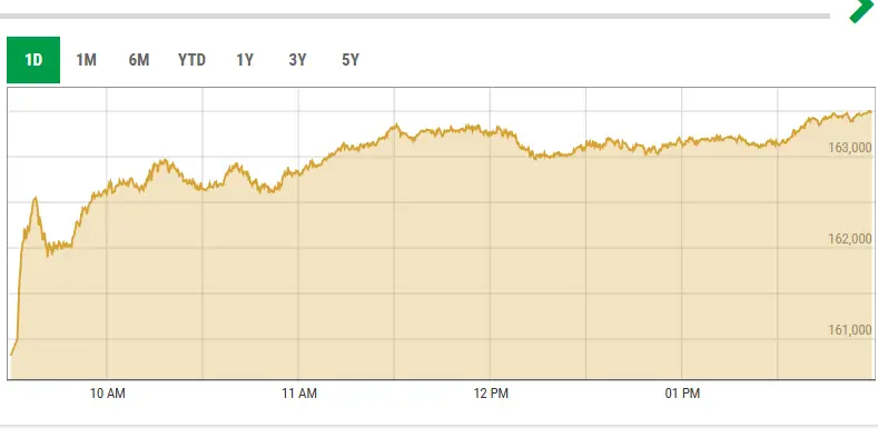 Today, the KSE-100 index surged 5,054.50 points, or 3.19pc, to 163,497.92 by 2pm.